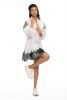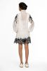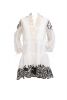 Fabric custom blend cotton/poly/silk -short single tier dress w/embossed embroidery w/scallop hem -lace ruffles at neck . Lace trim and pleats on bodice dryclean only-puff sleeves. White with black embroidery with scallop hem and sleeve emb